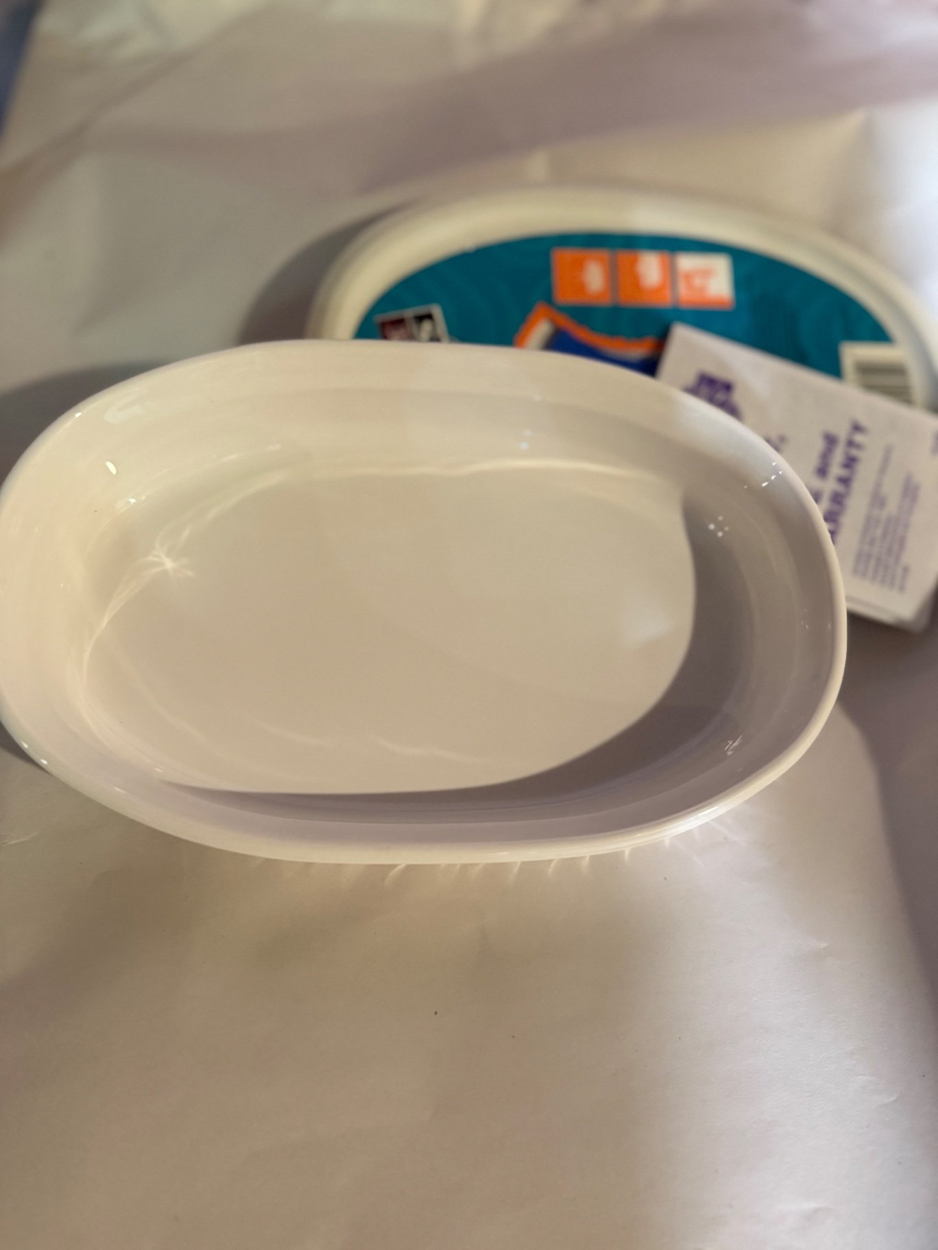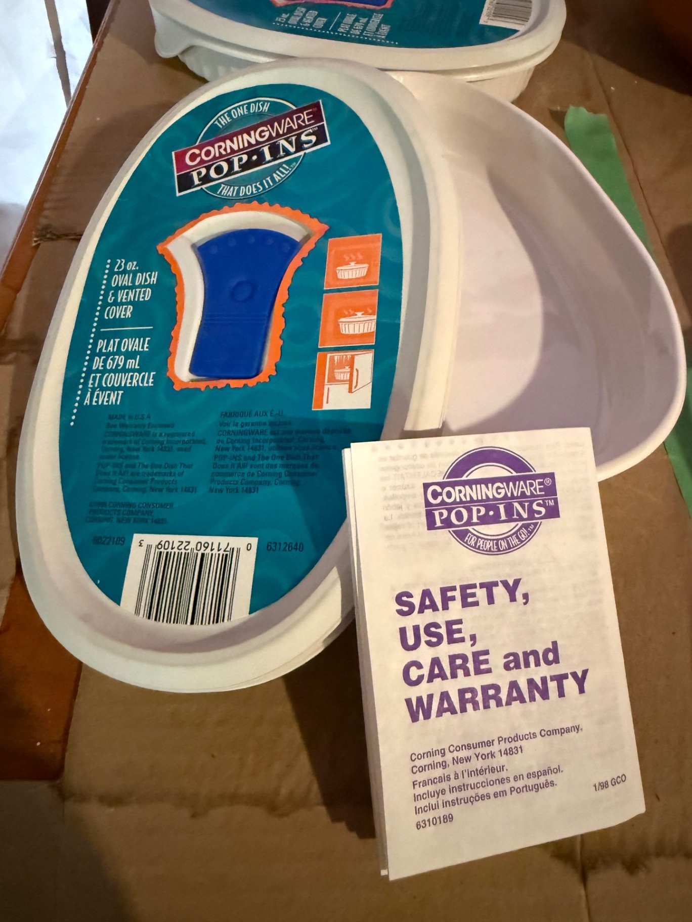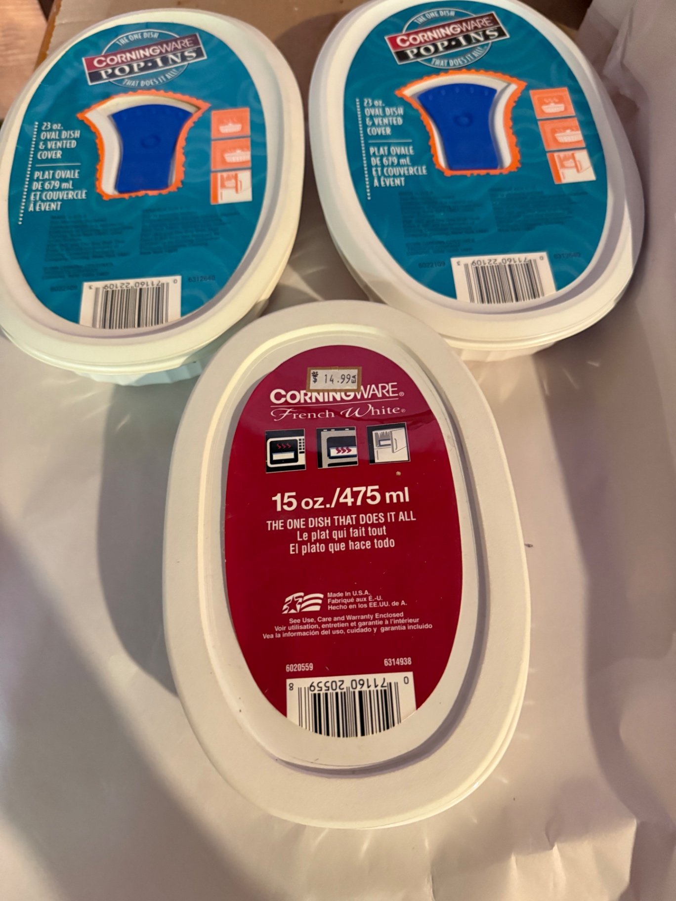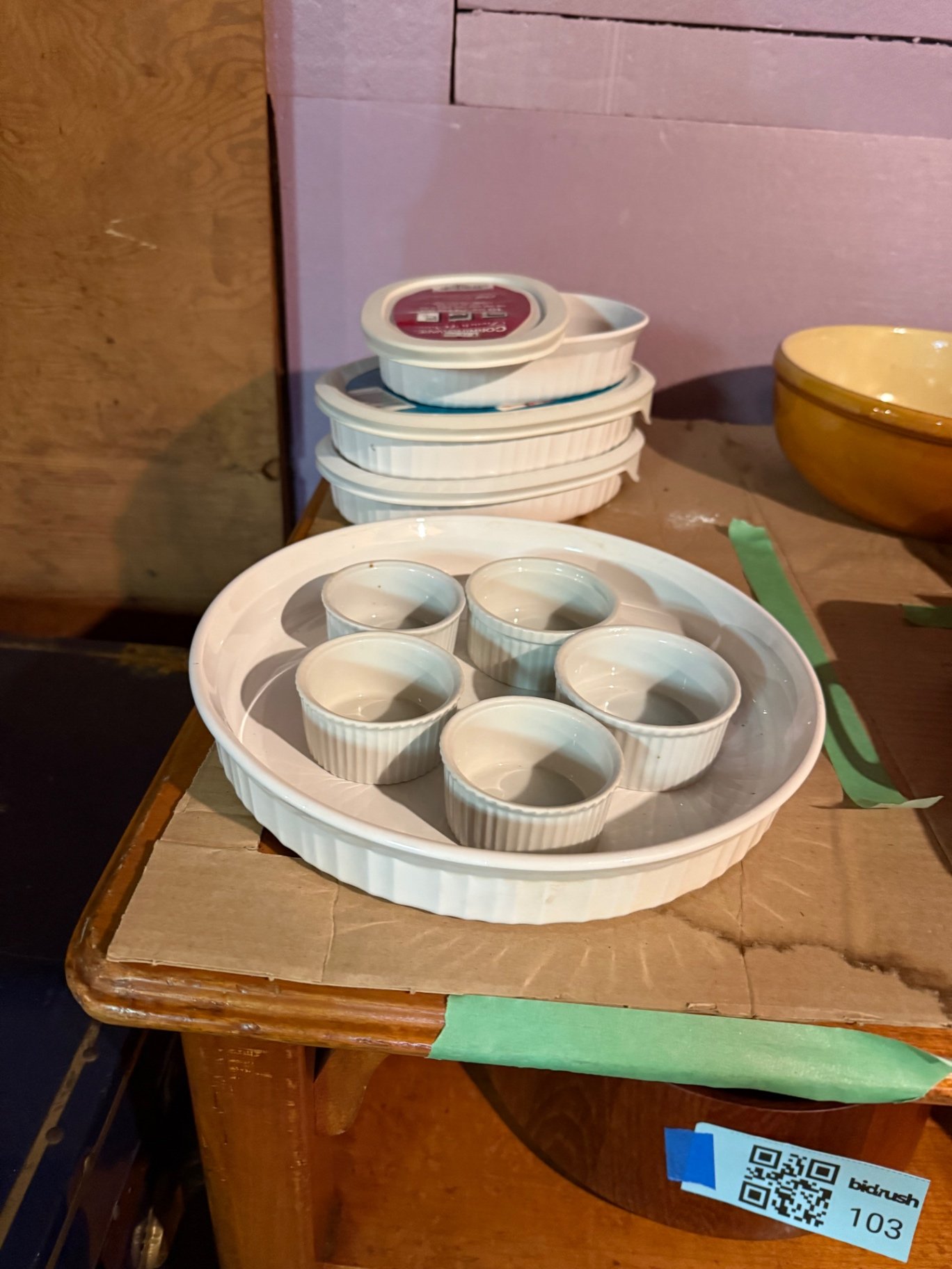 A collection of white ceramic bakeware pieces including a large round fluted dish with several small ramekins, multiple oval dishes with vented covers, and accompanying lids; branded CorningWare and Apilco France. **BRING OWN PACKING MATERIALS