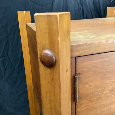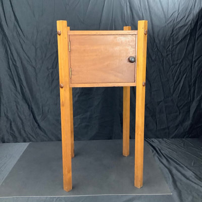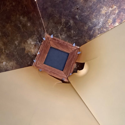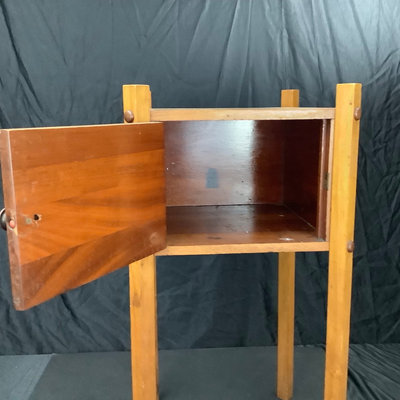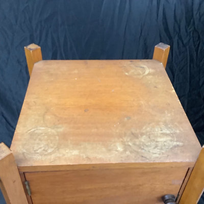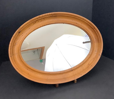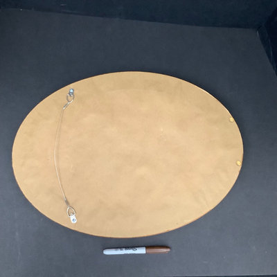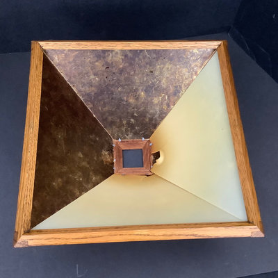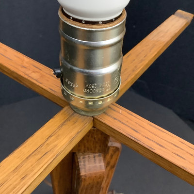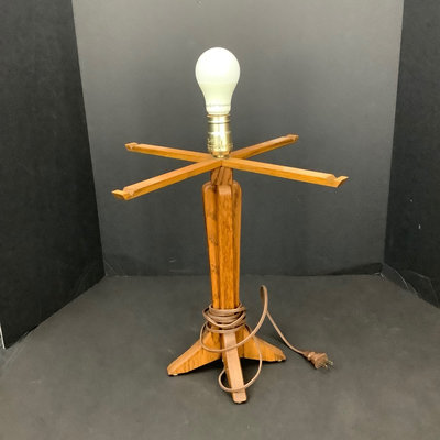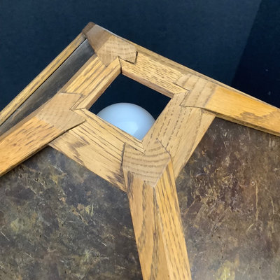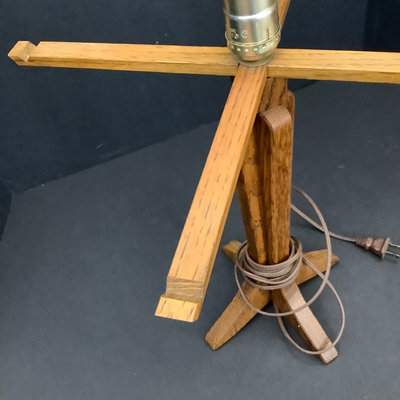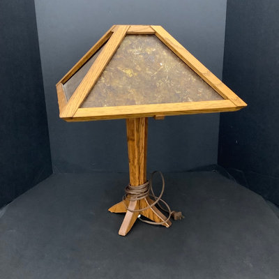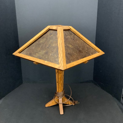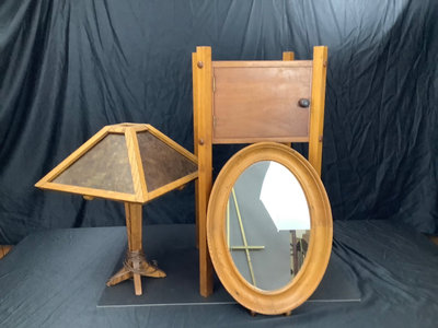 Small craftsman-style table 14x14x28.5, rings on top. Lamp with no harp, shade sits in grooves, note inside bulb damage and missing lining pieces in shade interior, 22h, shade 15sq, works. Oval mirror in wood frame, 18.75x13.75. 3 pieces.