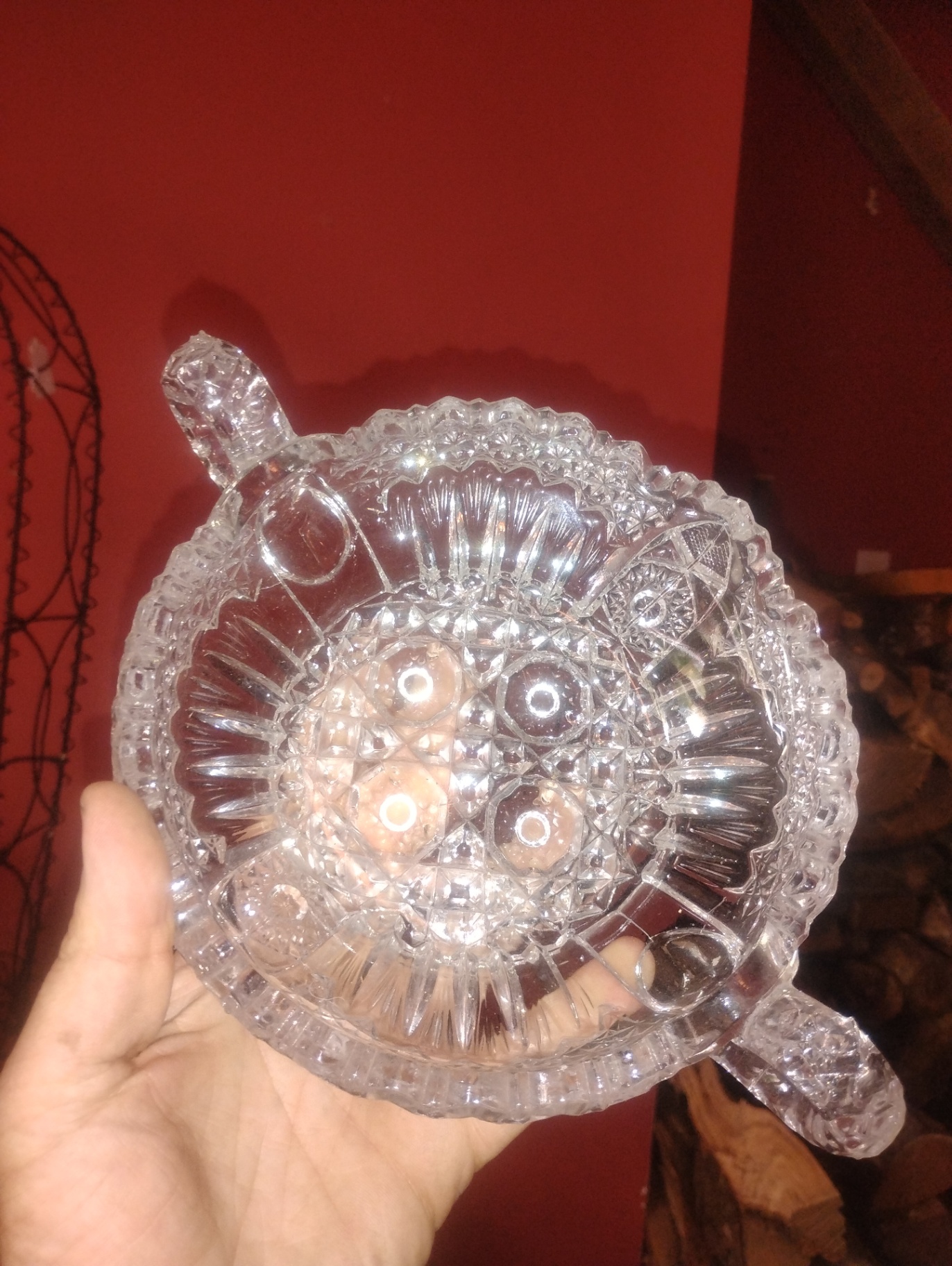 A clear cut-glass serving bowl with two decorative side handles and a scalloped edge, featuring intricate facets and a detailed pattern.