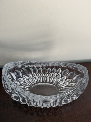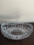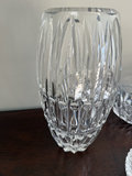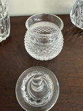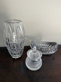 A collection of clear crystal pieces consisting of a 10-inch Waterford vase, a Waterford honey jar with lid, and a Gorham dish.