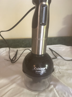 A Cuisinart Smart Stick immersion blender with a metal shaft and black plastic base/chopper attachment
