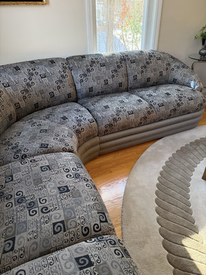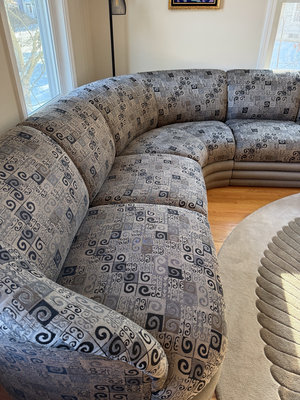A large curved sectional sofa in gray fabric with a geometric square-and-scroll pattern, approx 7-8’ each