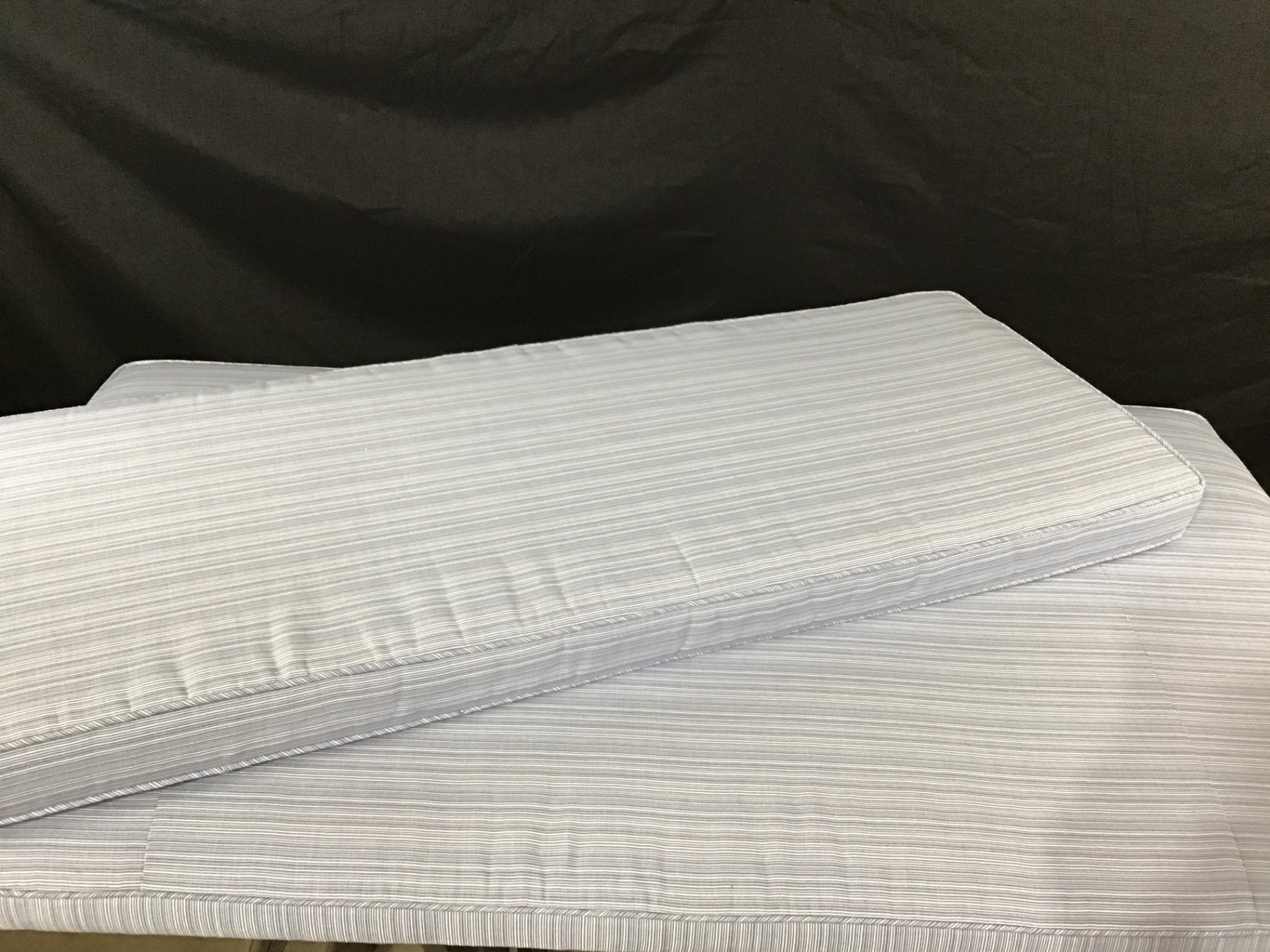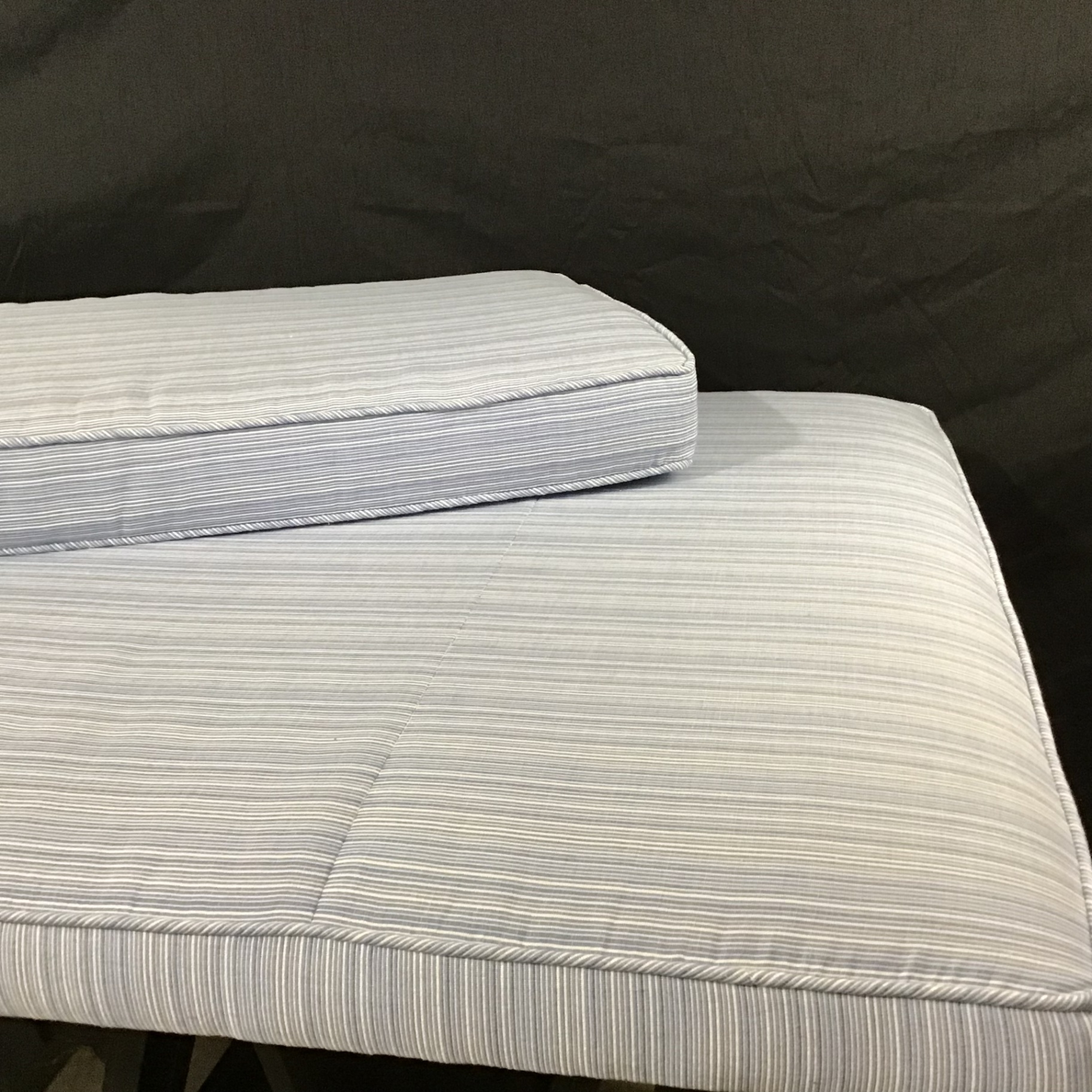Custom made Upholstered headboard, 66x36 and window cushion, 56x23. Both in blue and white striped fabric. 2 pieces.