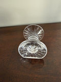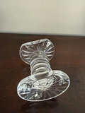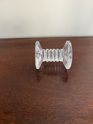 Clear cut-glass decorative piece with two flat, starburst-patterned discs at either end connected by a ribbed central stem.