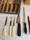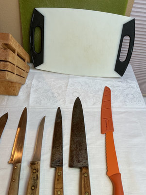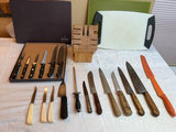 Wood and plastic handle cutlery, a wood block knife holder, and two cutting boards