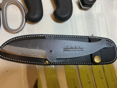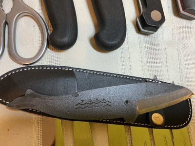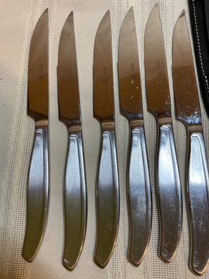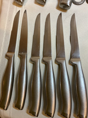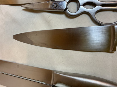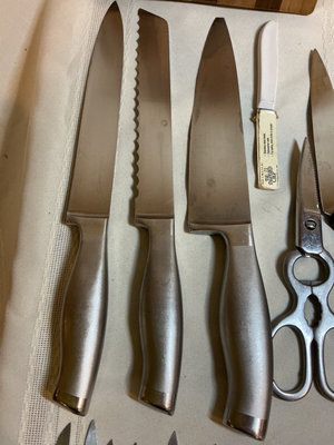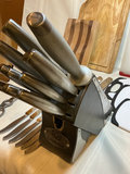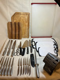 A collection of stainless steel kitchen cutlery of various sizes and blade shapes, including chef, santoku, serrated, and paring blades, along with a full set of Calphalon and block, kitchen scissors, wooden and plastic cutting boards. Included or pieces by Henckels Victorinox, and more. One blade by Calphalon is missing the tip.