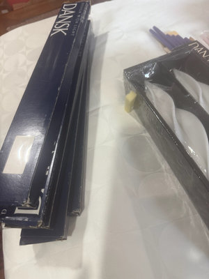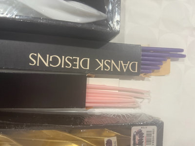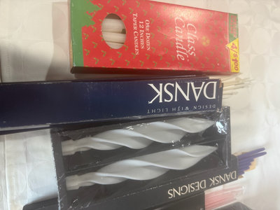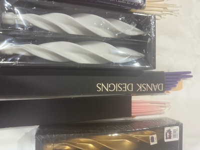A collection of Dansk Designs taper candles in various colors and shapes, including gold twisted candles, white twisted candles, pink and purple straight tapers, and blue spiral candles, with accompanying packaging.