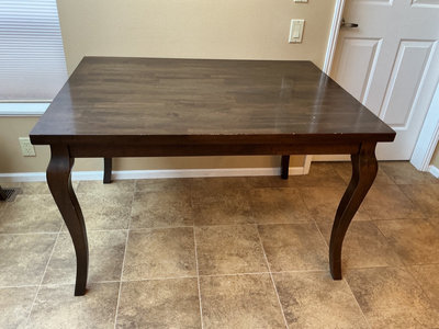 A dark-stained wooden dining table with four matching chairs featuring curved legs and ladder-back designs. Table 47”w 35”d x25” h. Chairs seat 17”w 18”h back 35”. Some wear in places.