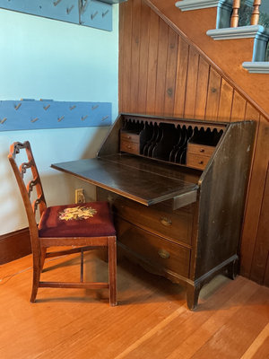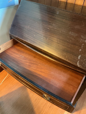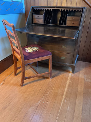 A dark stained wood secretary desk featuring a drop-front writing surface, upper storage with small drawers and vertical dividers, and two larger drawers beneath, paired with a matching wooden chair that has a carved back and a needlepoint upholstered seat. Measurements are 38 inches wide by 19 inches deep and 41 inches tall. Surface has scratches throughout. No key included.