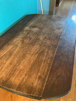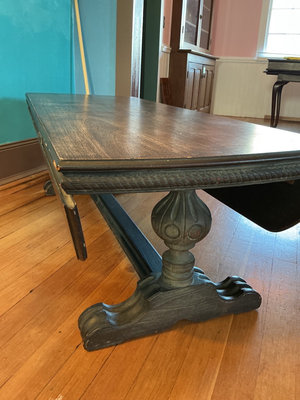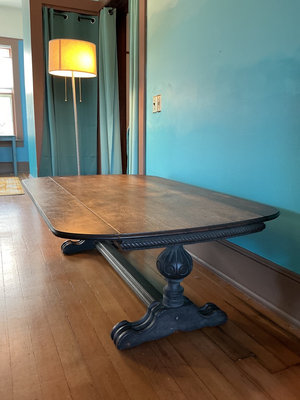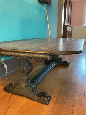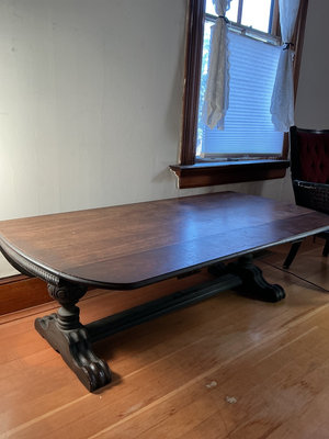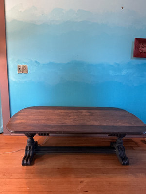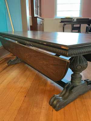 A large dark wooden coffee table with a long rectangular top with full down sides, and rounded corners, supported by two ornate carved pedestal bases connected by a central crossbeam. Folded out this table is 60 inches wide by 38 inches deep with the sides folded down. It’s 24 inches deep. Definitely shows its age in places.