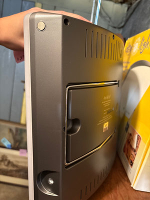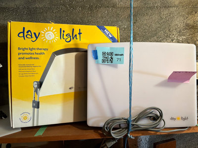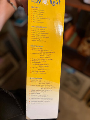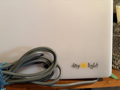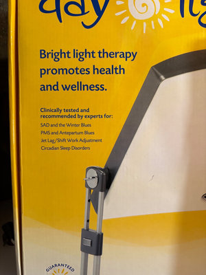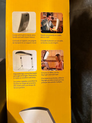 A white DayLight bright light therapy lamp accompanied by its yellow packaging box with product information, a long gray power cord, and small note elements. Dimensions: 16”x12.5”