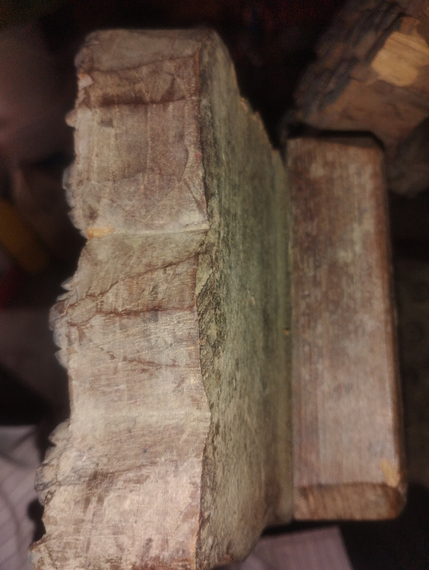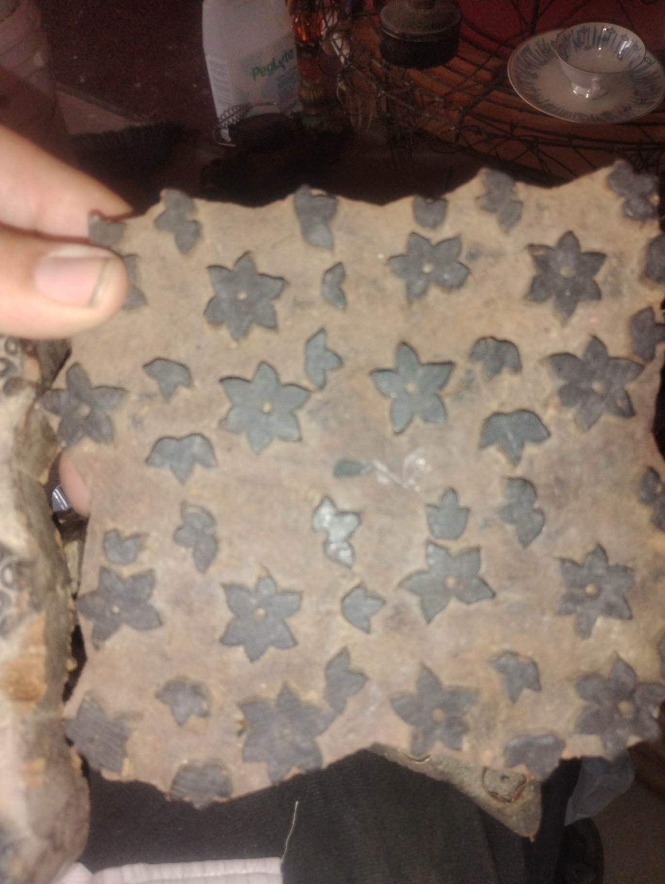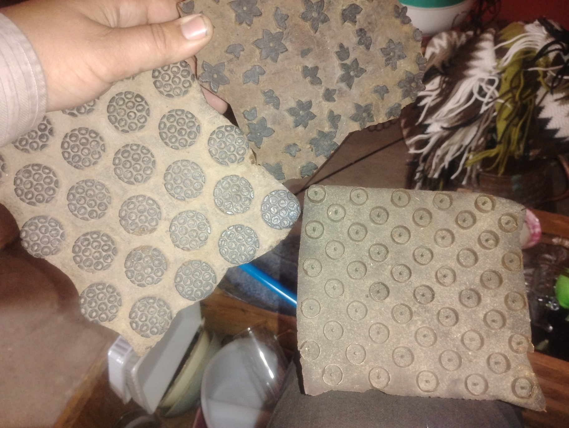 Ceramic tiles featuring circular dot patterns and flower-shaped motifs, along with a wooden block.