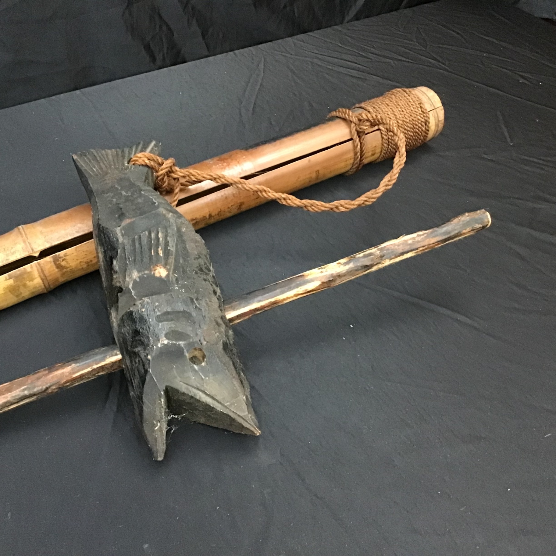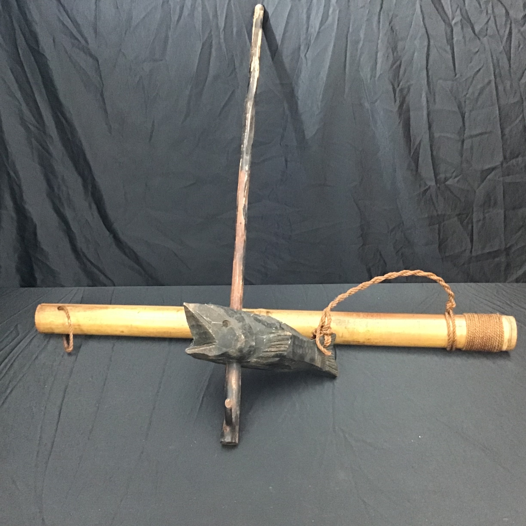 Hand carved wood fish on carved branch, attached with rope to a split bamboo tube. Perhaps a decorative representation of primitive island fishing? You man cave or she shed needs this! Bamboo 35.5w x 2.5d, pole 33w, fish 12x4x3. 1 piece.