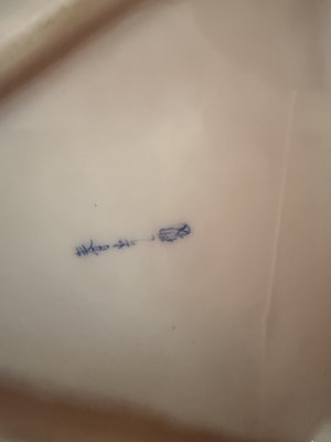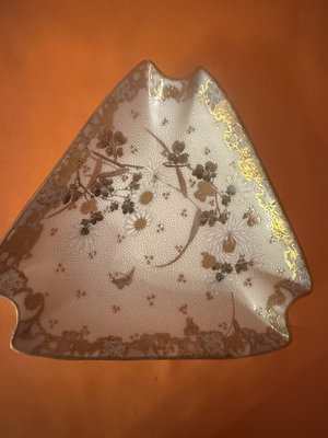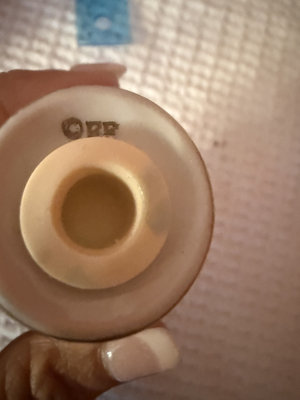 A white porcelain plate featuring a daisies and floral motif with a gold decorative edge, a round white cap-like object marked OPEN with a central hole, and a small white tag with handwritten markings appears to be japanese