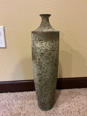 A large decorative hand-painted folding fan with cranes, a waterfall, and pine trees, paired with a tall green and gold speckled glass vase. The fan is 54 inches wide when it’s open.