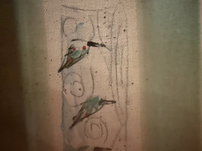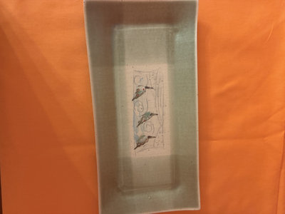 Rectangular metal tray with a fabric insert featuring a three-bird motif and decorative swirls; the fabric bears a stylized signature, and a card with a black-and-white square pattern is included.