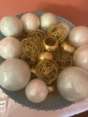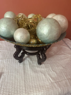 A decorative gold-dotted metal bowl on a dark carved pedestal, filled with pale pastel spheres and gold wire spherical ornaments.