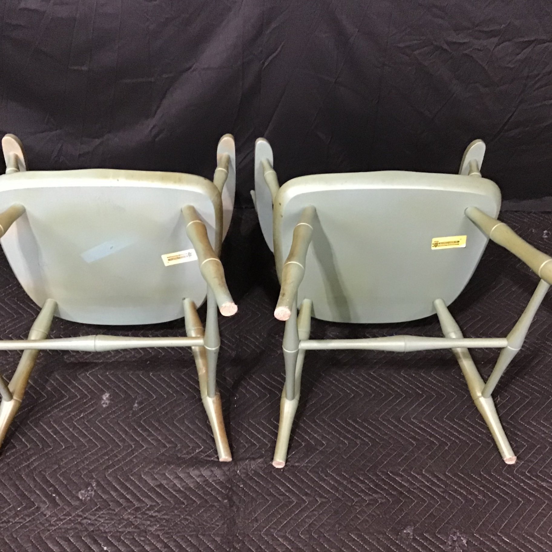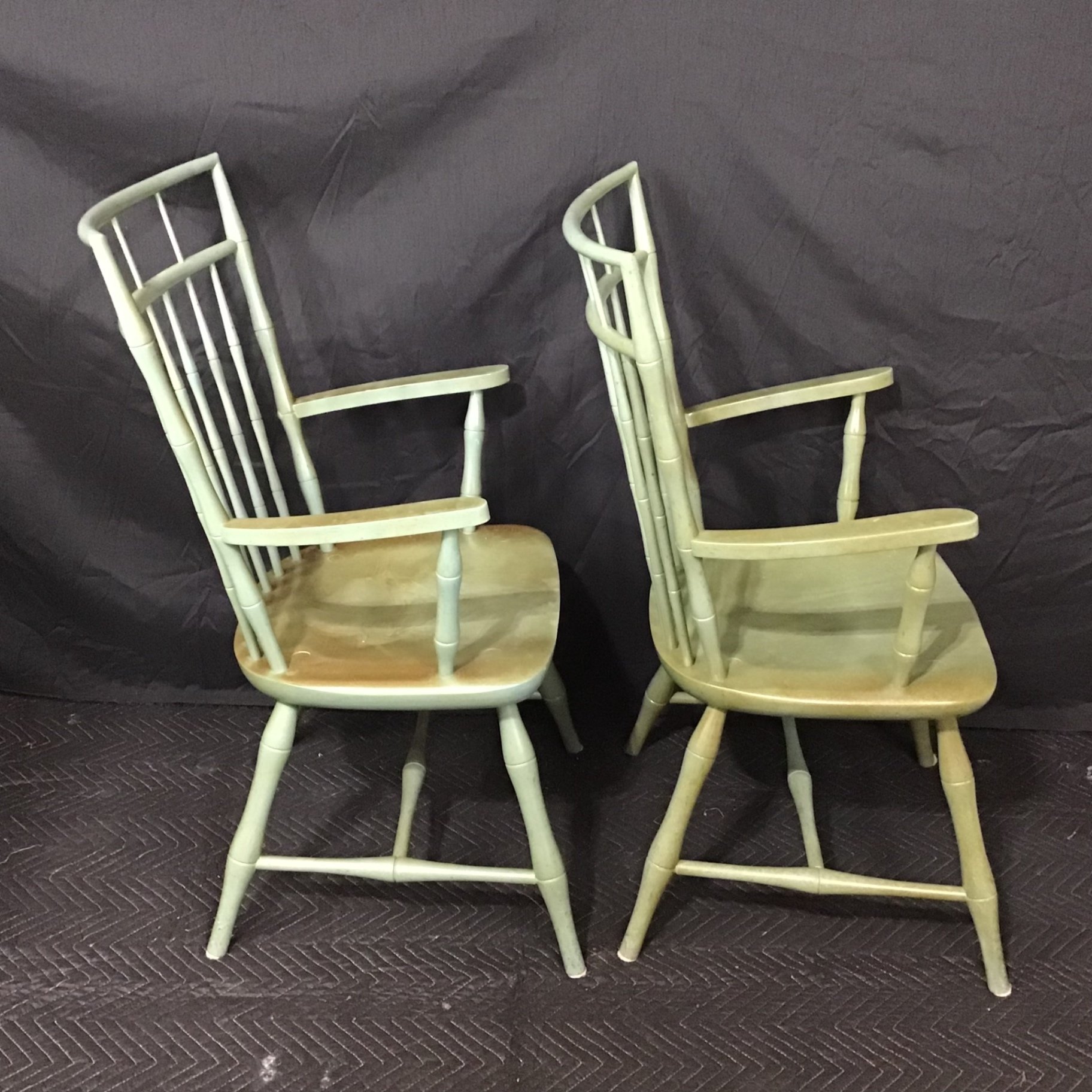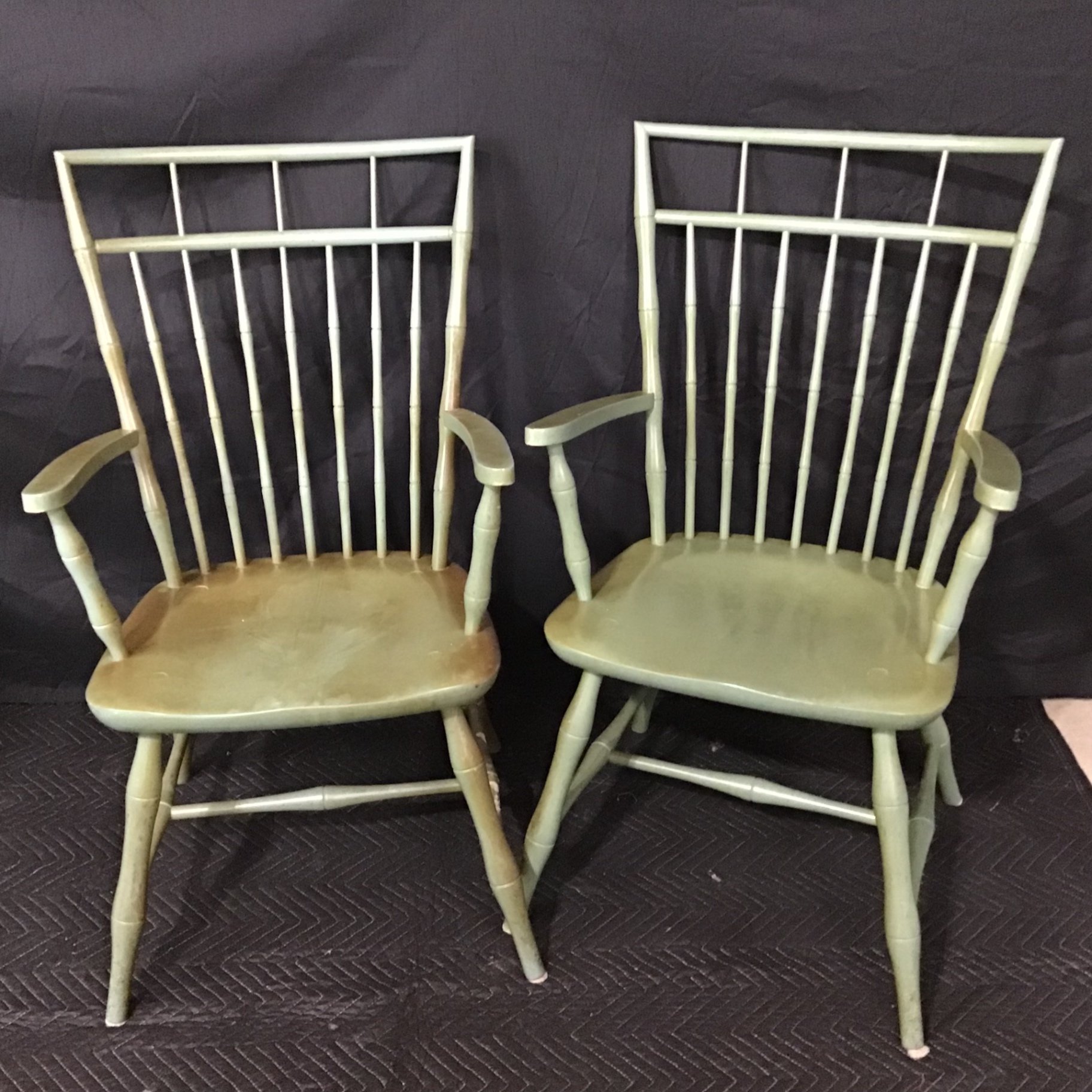Small hand painted decorative side table with painted tile top, each side has a different design, wear on paint near back sides, 16sq x 27.5h. Pair of vintage Windsor arm chairs, olive green color with discoloration from use, 22x18x37.5, 17h seat. 3 pieces.
