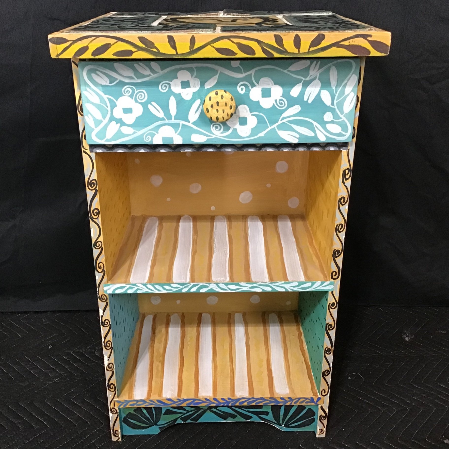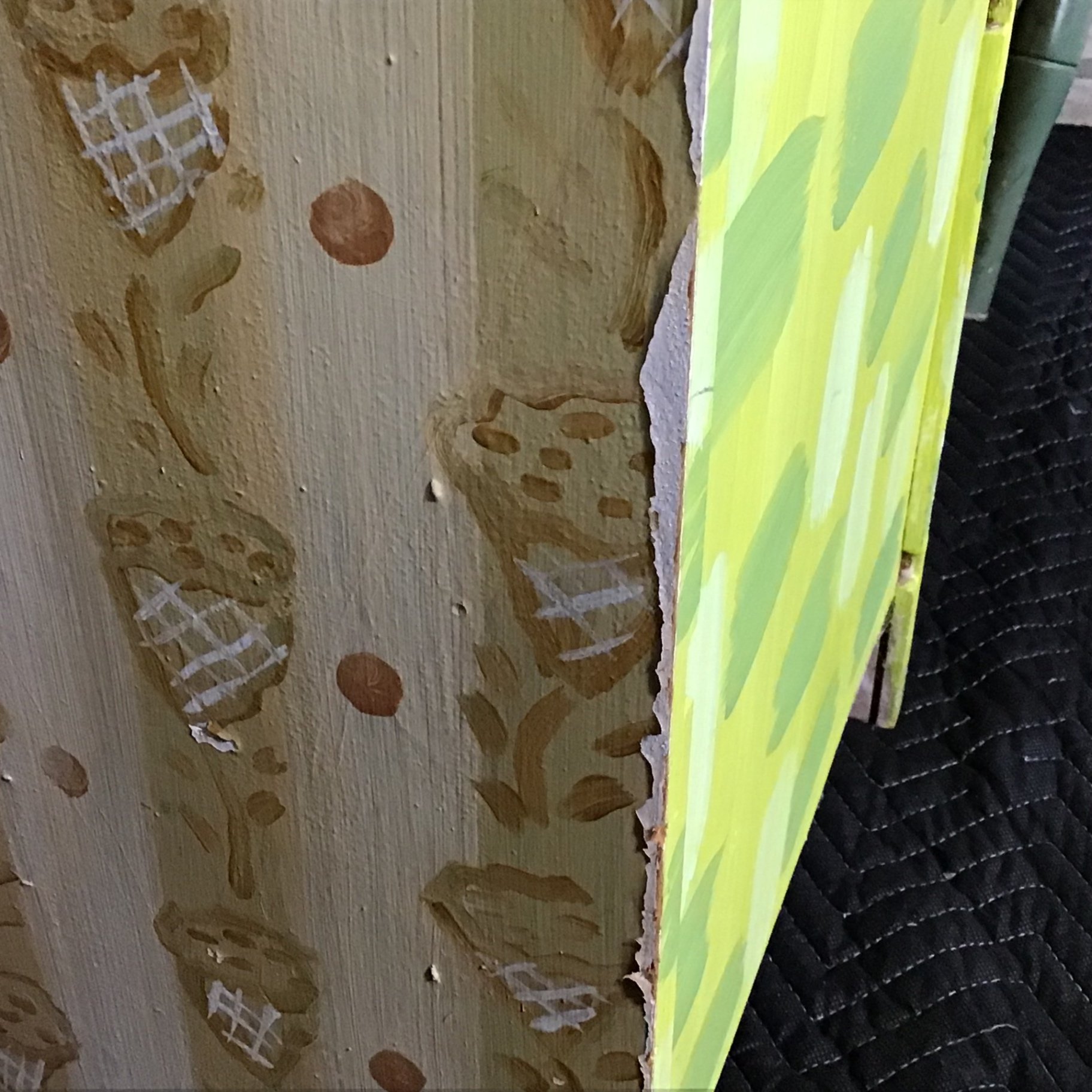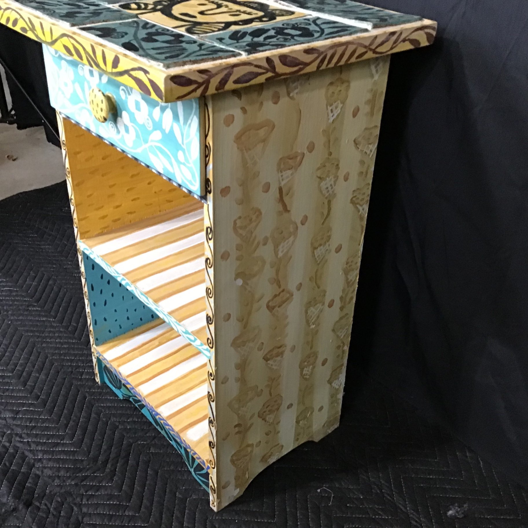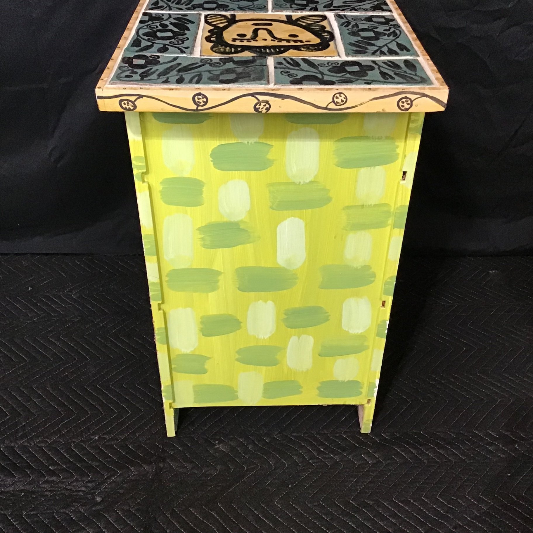 Small hand painted decorative side table with painted tile top, each side has a different design, wear on paint near back sides, 16sq x 27.5h. Pair of vintage Windsor arm chairs, olive green color with discoloration from use, 22x18x37.5, 17h seat. 3 pieces.