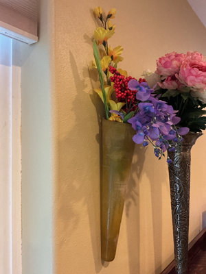 An amber glass tapered wall vase holding an assortment of flowers ( 17.5 inches tall, not including the flowers ) and a tall ornate metal vase containing faux pink and white peonies ( 24 inches tall, not including the flowers ).
