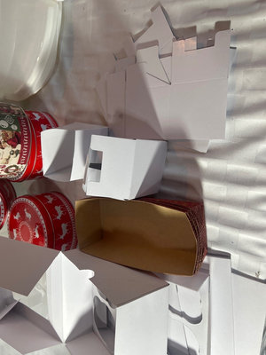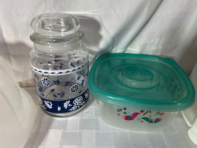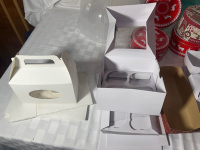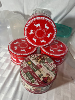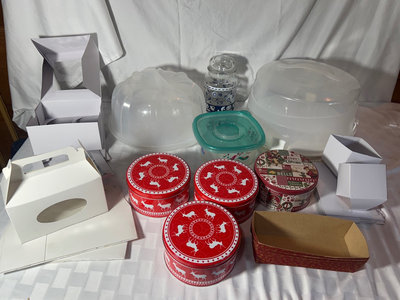 This fun lot includes two large plastic cake carrying items, one specifically for a Bundt cake. 4 small Xmas tins, a decorated Jar with lid and a decorated Gladware piece, plus folding cardboard pastry packages.