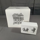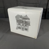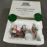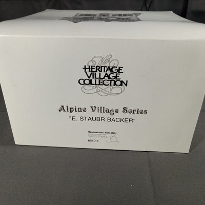 Alpine Village Series from the Heritage Village Collection, made exclusively for Dept. 56. Hand painted porcelain. No. 5619-7 Buying Baker's Bread, set of 2 figurines, produced between 1992-1995. No. 56. 6540-4 E Staubr Backer (Bakery), with light, produced between 1986-1997. Gently used and stored with original packaging. 2 pieces.