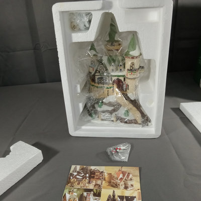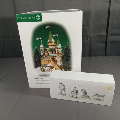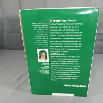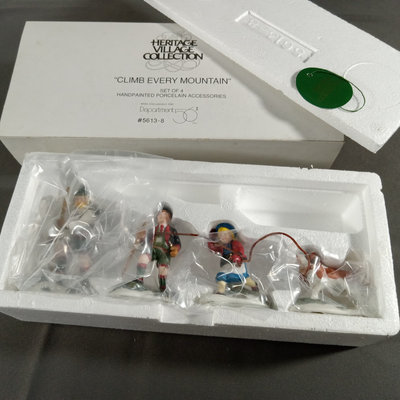 Alpine Village Series from the Heritage Village Collection, made exclusively for Dept. 56. Hand painted porcelain. No. 5613-8 Climb Every Mountain, set of 4 figurines, produced between 1990-1999. No. 56. 56216 Hofburg Castle, with light, produced between 2000-2002. Gently used and stored with original packaging. 2 pieces.