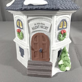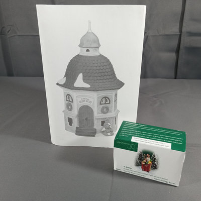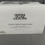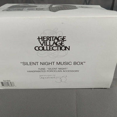 Alpine Village Series from the Heritage Village Collection, made exclusively for Dept. 56. Hand painted porcelain. No. 56203 St. Nicholas figurine, produced between 1998-2005. No. 56180 Silent Night Music Box, untested, produced between 1995-1999. Gently used and stored with original packaging. 2 pieces.