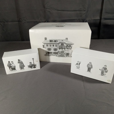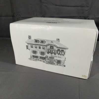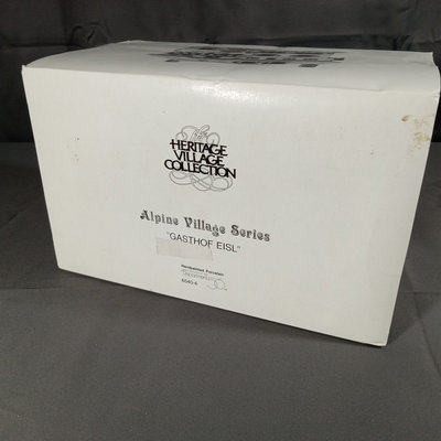 Alpine Village Series from the Heritage Village Collection, made exclusively for Dept. 56. Hand painted porcelain. No. 5616-2 The Toy Peddler, set of 3 figurines, produced between 1990-1998. No. 5588-3 A Christmas Carol Morning, set of 3 figurines, produced between 1989-2002. No. Gasthof Eisl (Inn), NO LIGHT, produced between 1986-1996. Gently used and stored with original packaging. 3 pieces.