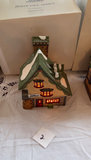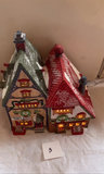 6 Dept 56 Collectible Christmas Houses 1 “Elfin Snow Cone Works" 2.” Elf Bunk House" 3. “Obies Books and Letrinka"s candy” 4. “Post Office" 5. "Reindeer Barn" 6. "Tassies Mittens and Hassel's Woolies"