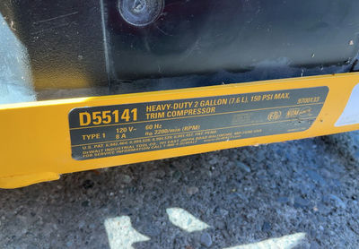 Heavy duty 2 gallon DeWalt trim compressor. Includes hoses. Tested. The DEWALT D55141 is a 2-gallon, 150 PSI maximum pressure portable trim compressor featuring a 2.0-HP (peak) electric motor and an oil-free, maintenance-free pump. It is designed for finish carpentry, trim, and small air tool applications, delivering 2.0 SCFM at 90 PSI with a 79 dBA noise level. Key features include a roll cage for durability and a compact design