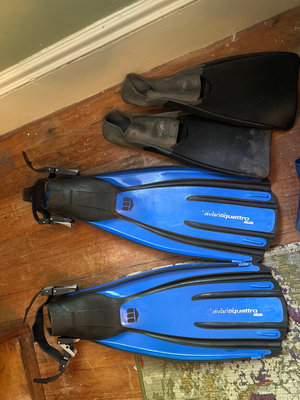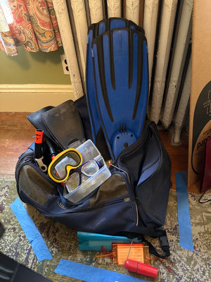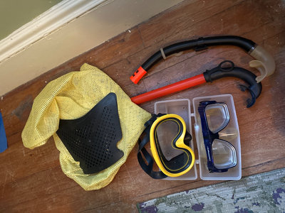 Two sets of fins, snorkeling masks (yellow frame), snorkels, mesh gear bag, and adjustable weight belt. Duffle bag.