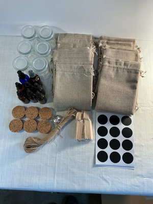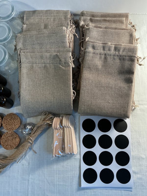 A collection of craft supplies including burlap drawstring bags, cork coasters, glass jars with lids, amber dropper bottles, a sheet of round black labels, twine, and small wooden spoons for DIY projects.