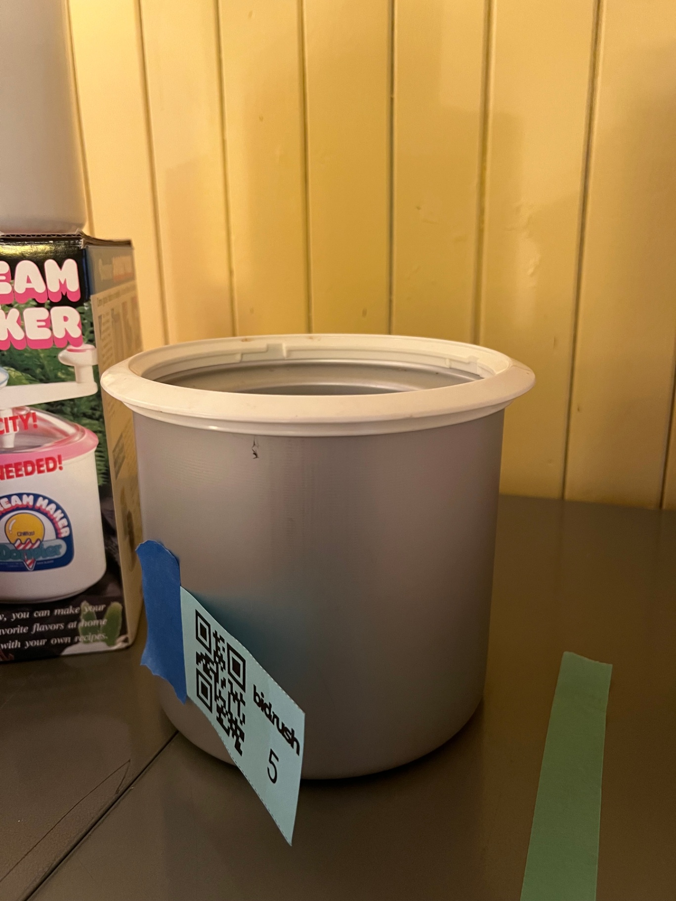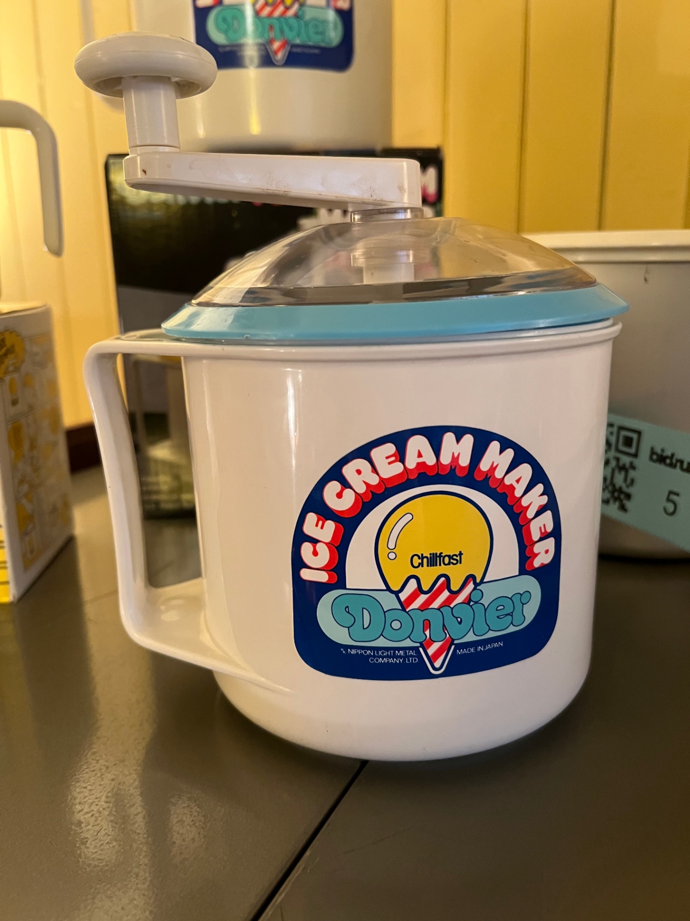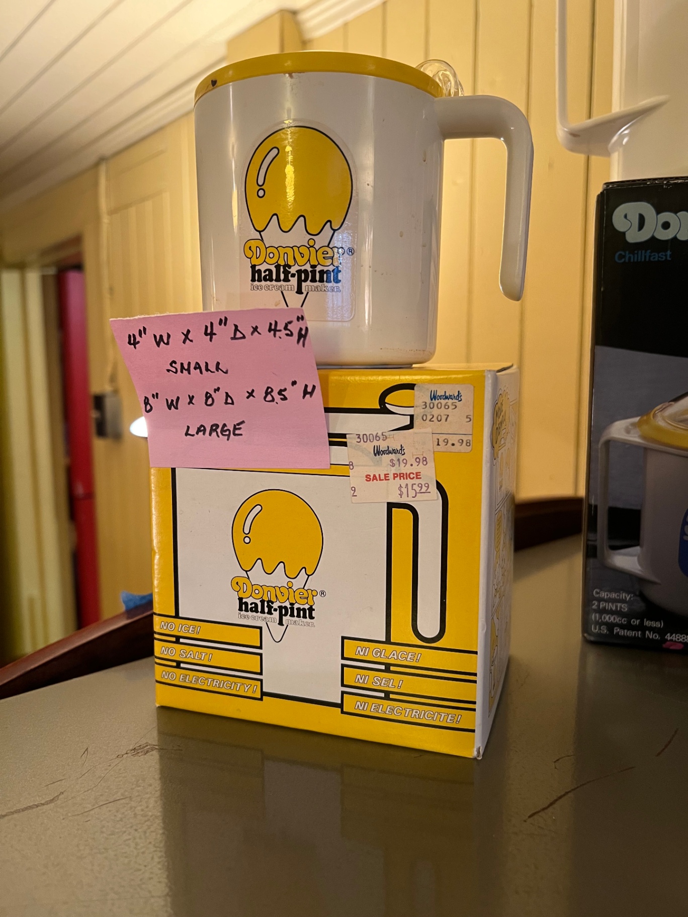 A collection of Donvier ice cream makers, components and packaging, including a crank-operated ice cream maker unit with paddle and inner can, a large boxed ice cream maker, a Donvier half-pint container, and related product boxes.