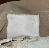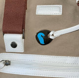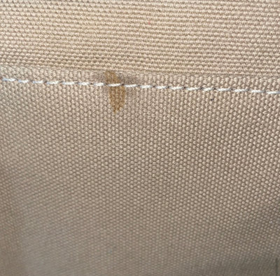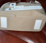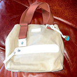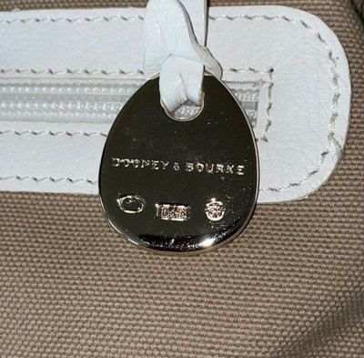 Small canvas and leather tote with exterior and interior pockets, by Dooney & Bourke. Includes original registration card. Small stain on underside. 11 x 4 x 10.5. 1 piece.