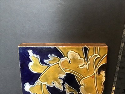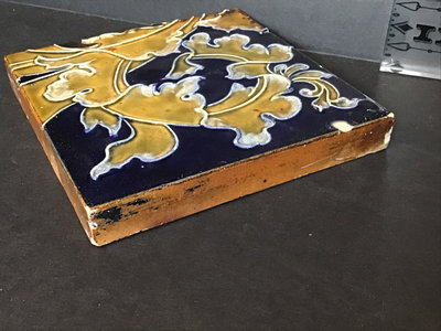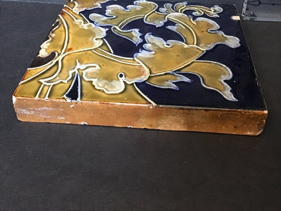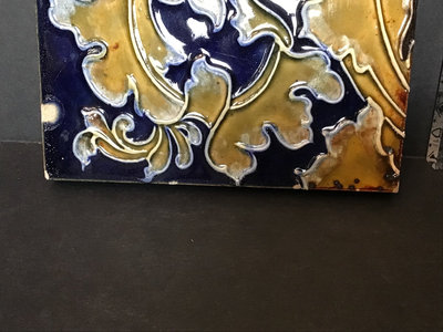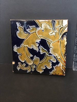 Doulton's Stoneware fireplace tile, green leaf design on a cobalt blue background, small chips around edges consistent with age and use, 6sq. 1 piece.