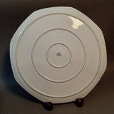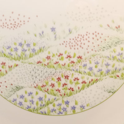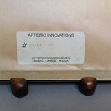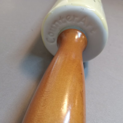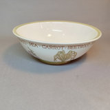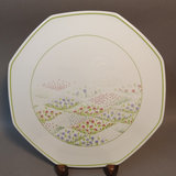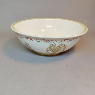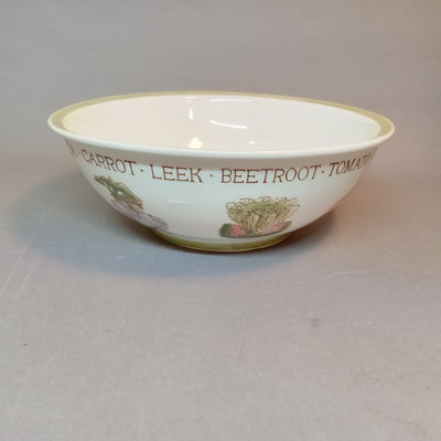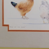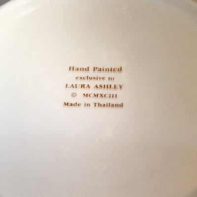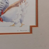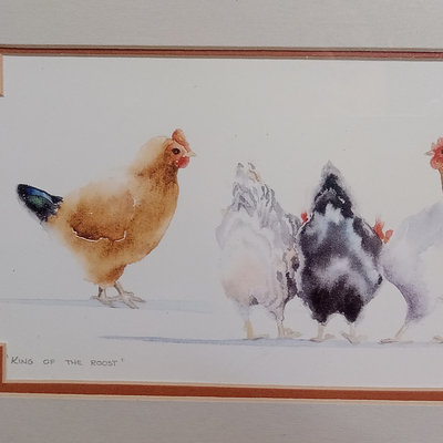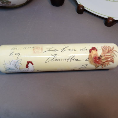 Heinrich Germany cake plate, 13.25d. Vegetable bowl, hand painted exclusively for Laura Ashley, c. 1993, made in Thailand, 10d. Counter Art ceramic rooster rolling pin, 17.5w. King of the Roost by V. Pfeiffer framed rooster print, 9.5x21.5 framed. Hand blown glass toothpick holder. 5 pieces.