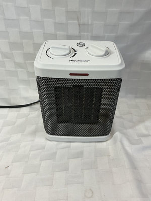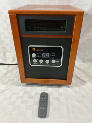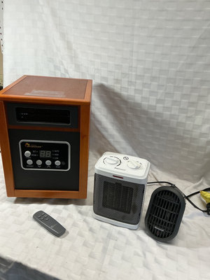 Dr. Heater wooden-framed infrared space heater with a digital control panel and remote, a white ProBreeze compact heater, and a black Honeywell compact heater. Tested.