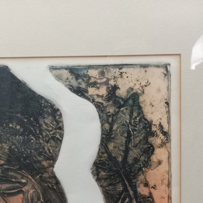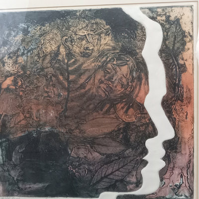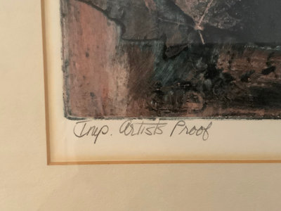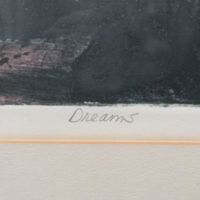 Alice W. (Emery) Enge (American contemporary), often signing her work as Ali or Ali Web, many of her works were woodcut or linocut. Dreams, Imp. Artists Proof, woodcut print. Art 16.25x17.25, frame 22.75x23.75. 1 piece.