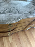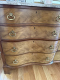 Drexel mahogany serpentine-front bureau with a marble top and brass hardware, featuring multiple curved drawers and bracket feet. 70x20x35