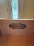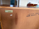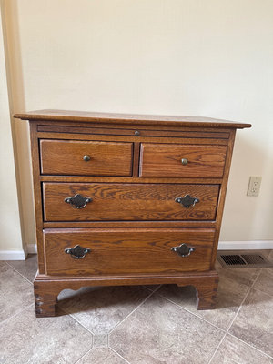A LANE DREXEL oak dresser with a slide out writing surface and four drawers: two small top drawers, one mid-size drawer, and one large bottom drawer. It features metal hardware and a 'Lineage' brand plate with a 'Drexel Heritage' sticker on the back panel. 30" x 18" x 30"/