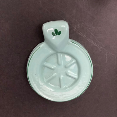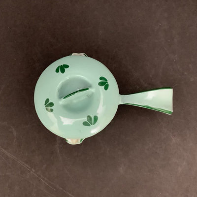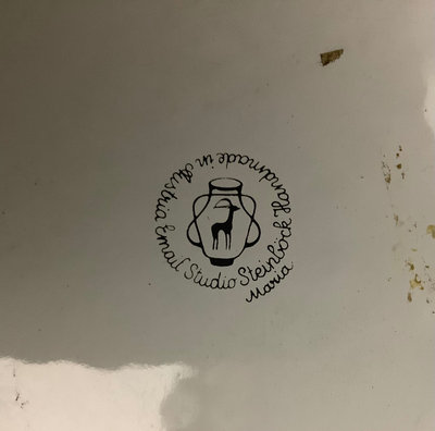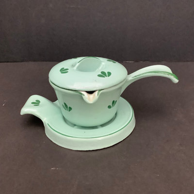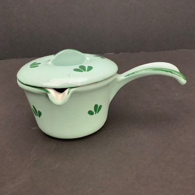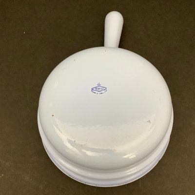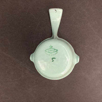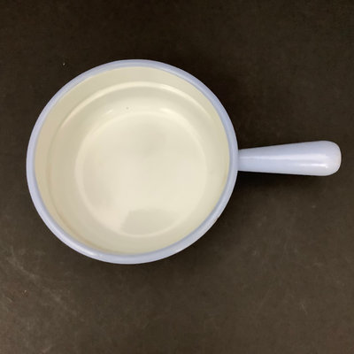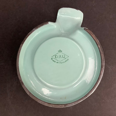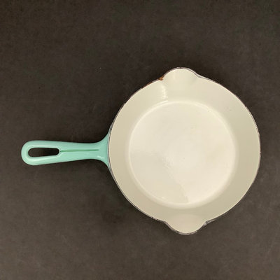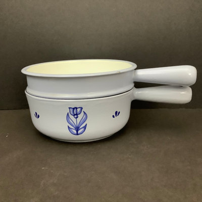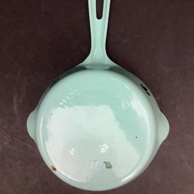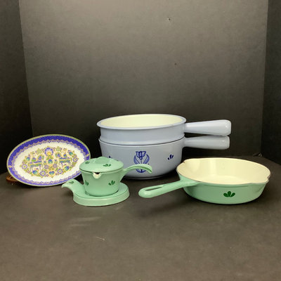 Vintage Dru blue on blue enameled, cast iron double boiler, no lid, made in Holland, number 4081-20, 8.25dx 5h. Dru small frying pan number 17, green on green, 8d. Dru butter warmer with trivet, green on green 4.5d. Emait Studio Steinbuck enamel on metal dish, handmade in Austria,4.5x 9.75. 6 pieces.