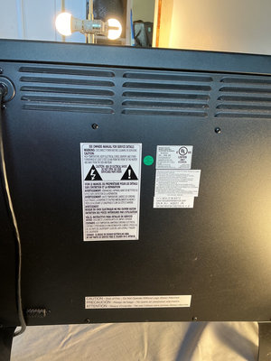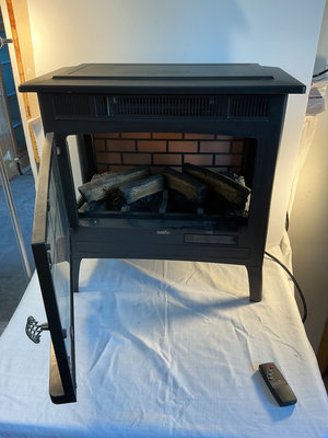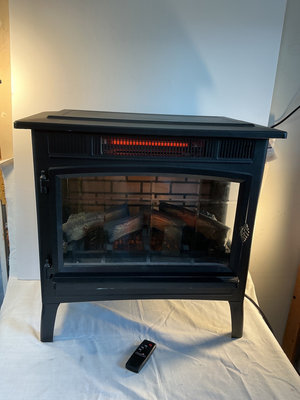 A black freestanding electric fireplace stove with a glass front, faux log interior, and an attached power cord; includes a Duraflame remote control. 24”x 12” x 23”. Tested.