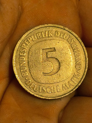 of German 5-Mark coins: one shows the numeral 5 with the inscription Bundesrepublik Deutschland Deutsche Mark, and the other features a heraldic eagle with the year 1975.