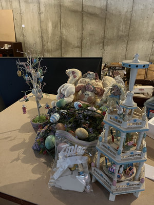 An assortment of Easter decorations including a white multi-tier decorative structure with pastel accents, a wire tree with hanging pastel eggs, plush Easter figures, decorative eggs, and a bag of craft pieces.