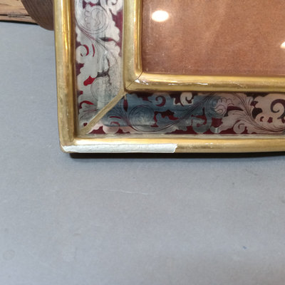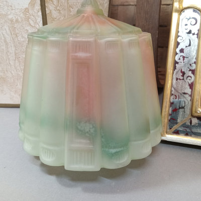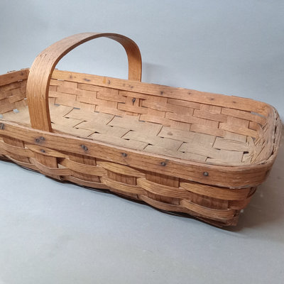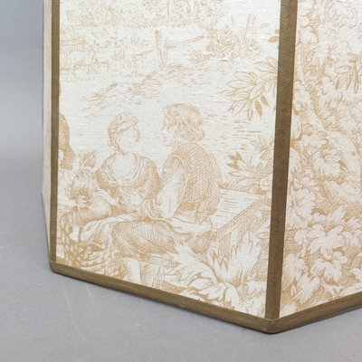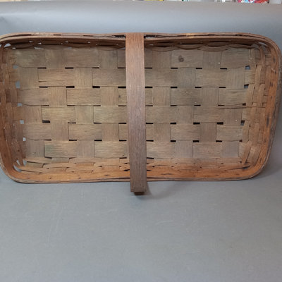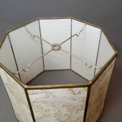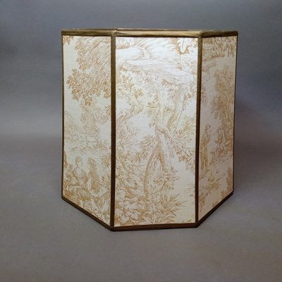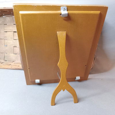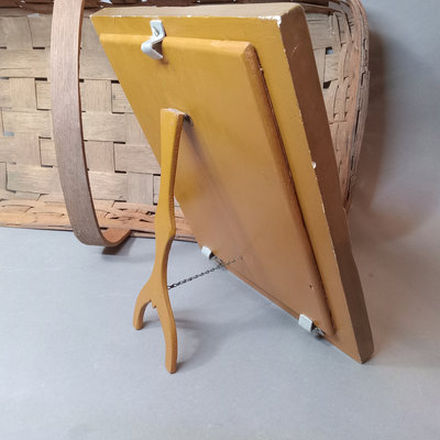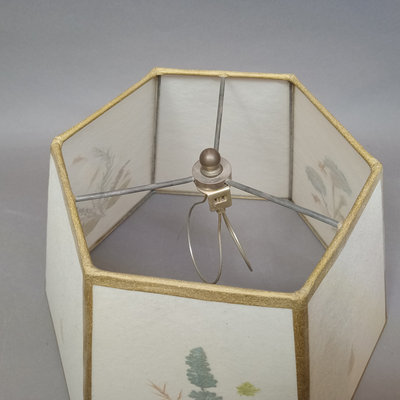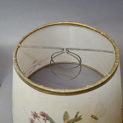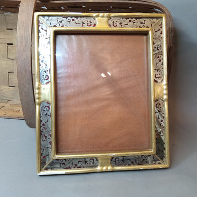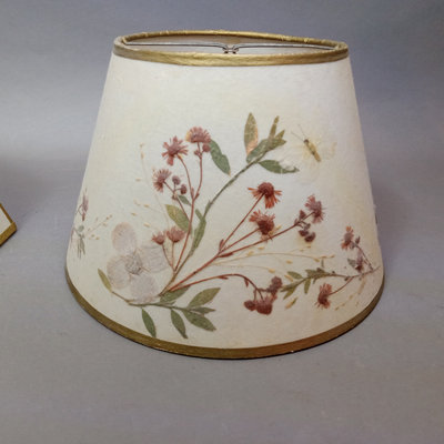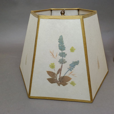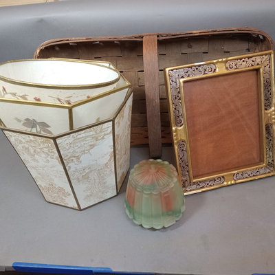 Rustic flower gathering basket, 25x13x8. Antique table-top frame, 12.25x10.25 with 9.5x7.5 opening, gilt lacquer is chipping in places. Glass shade, 6d x 5.5h. Dried flower bulb-clip shades, 10.25d x 6.75h and 12d x 8h. Toile shade, 12d x 10h. 6 pieces.