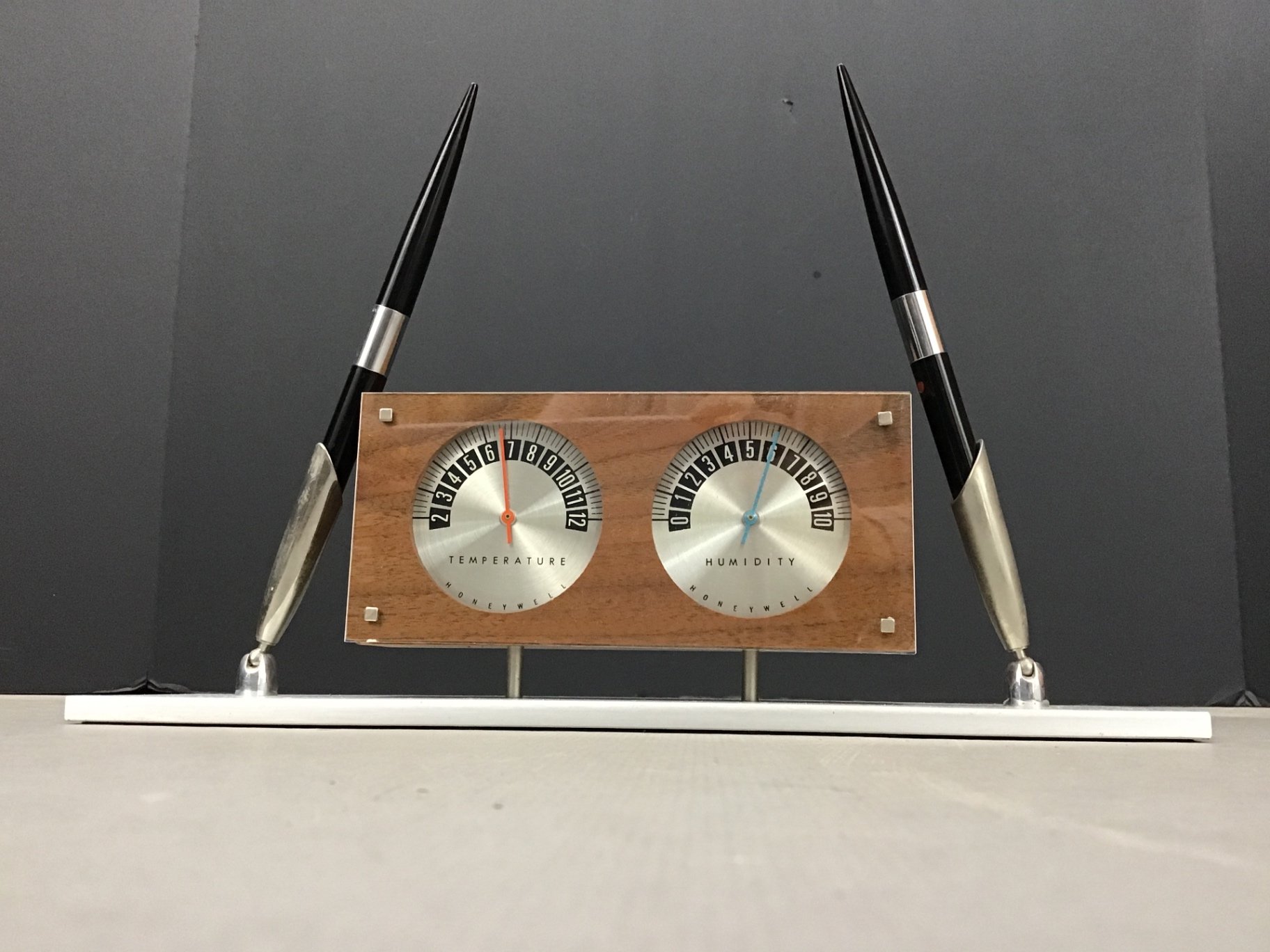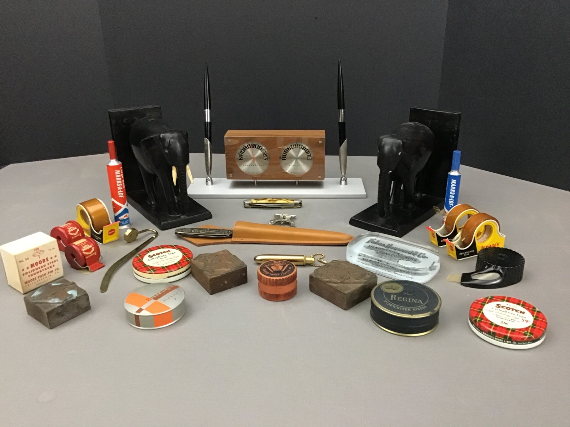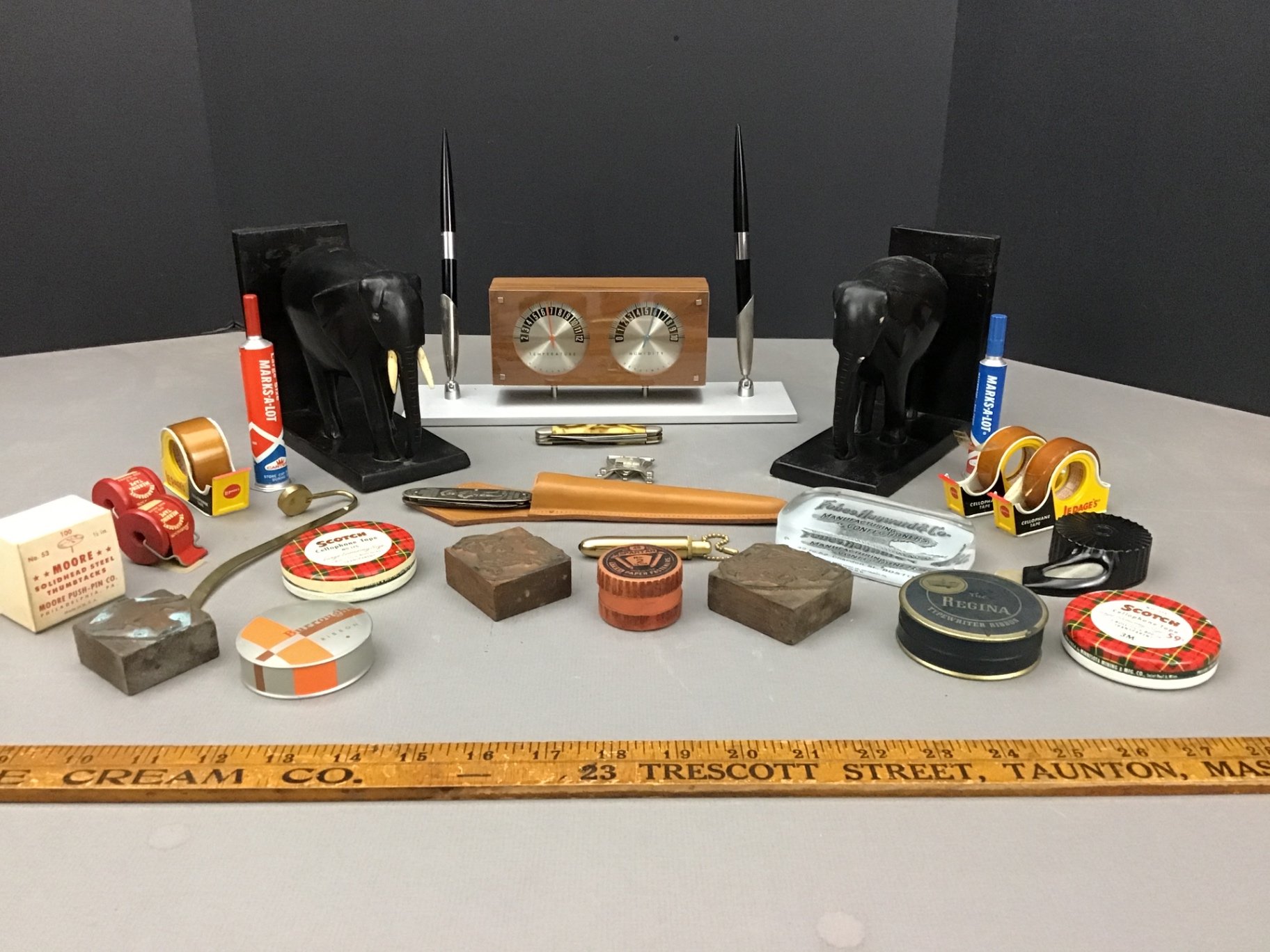 Honeywell temperature and humidity clocks with pens, 11x3x8. Elephant book ends, made in Tanganyika British East Africa, 6x3x5.5. Metal stamps, tape dispensers, Blue Bell Brand letter opener and more, 26 pieces.