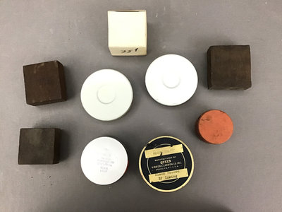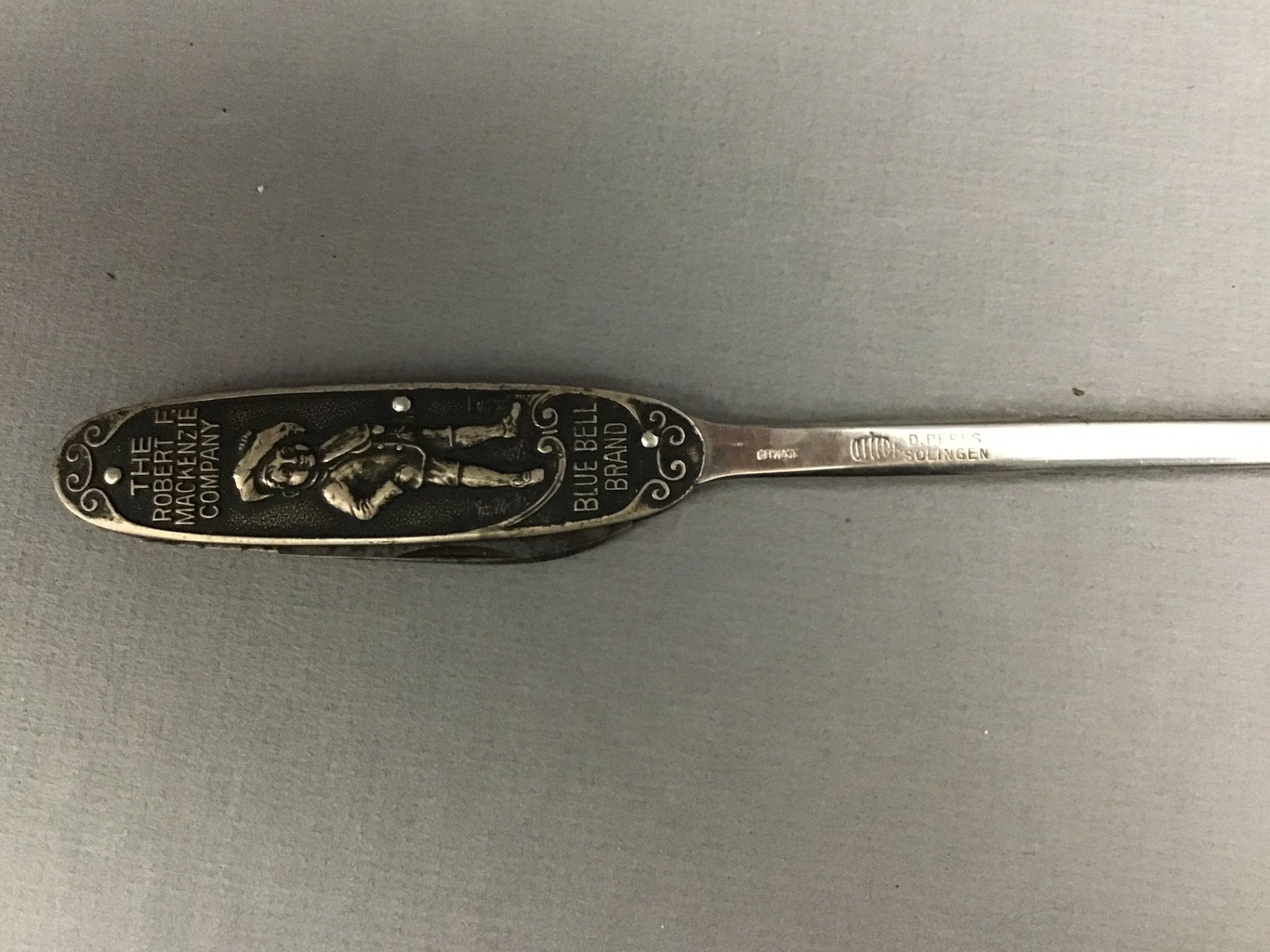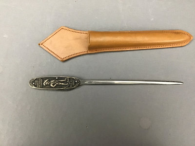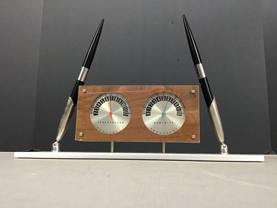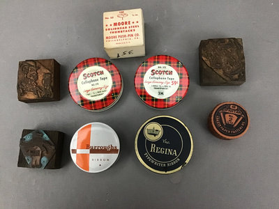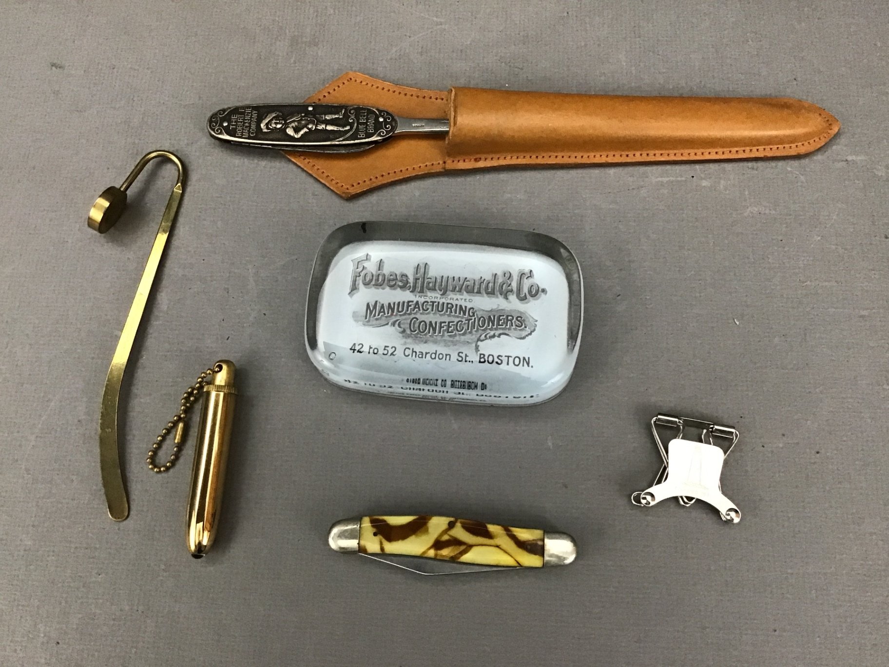 Honeywell temperature and humidity clocks with pens, 11x3x8. Elephant book ends, made in Tanganyika British East Africa, 6x3x5.5. Metal stamps, tape dispensers, Blue Bell Brand letter opener and more, 26 pieces.