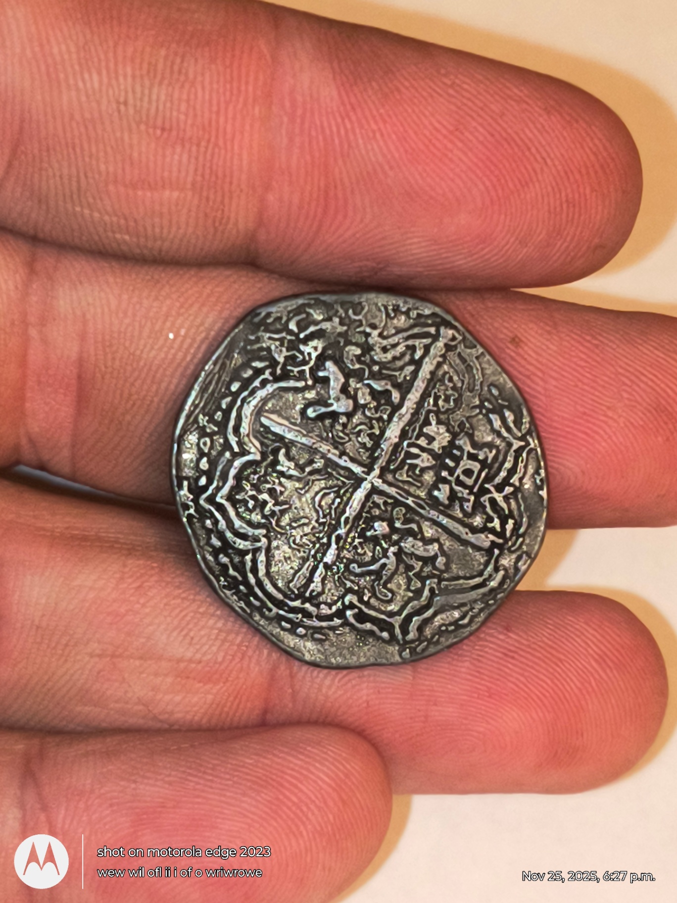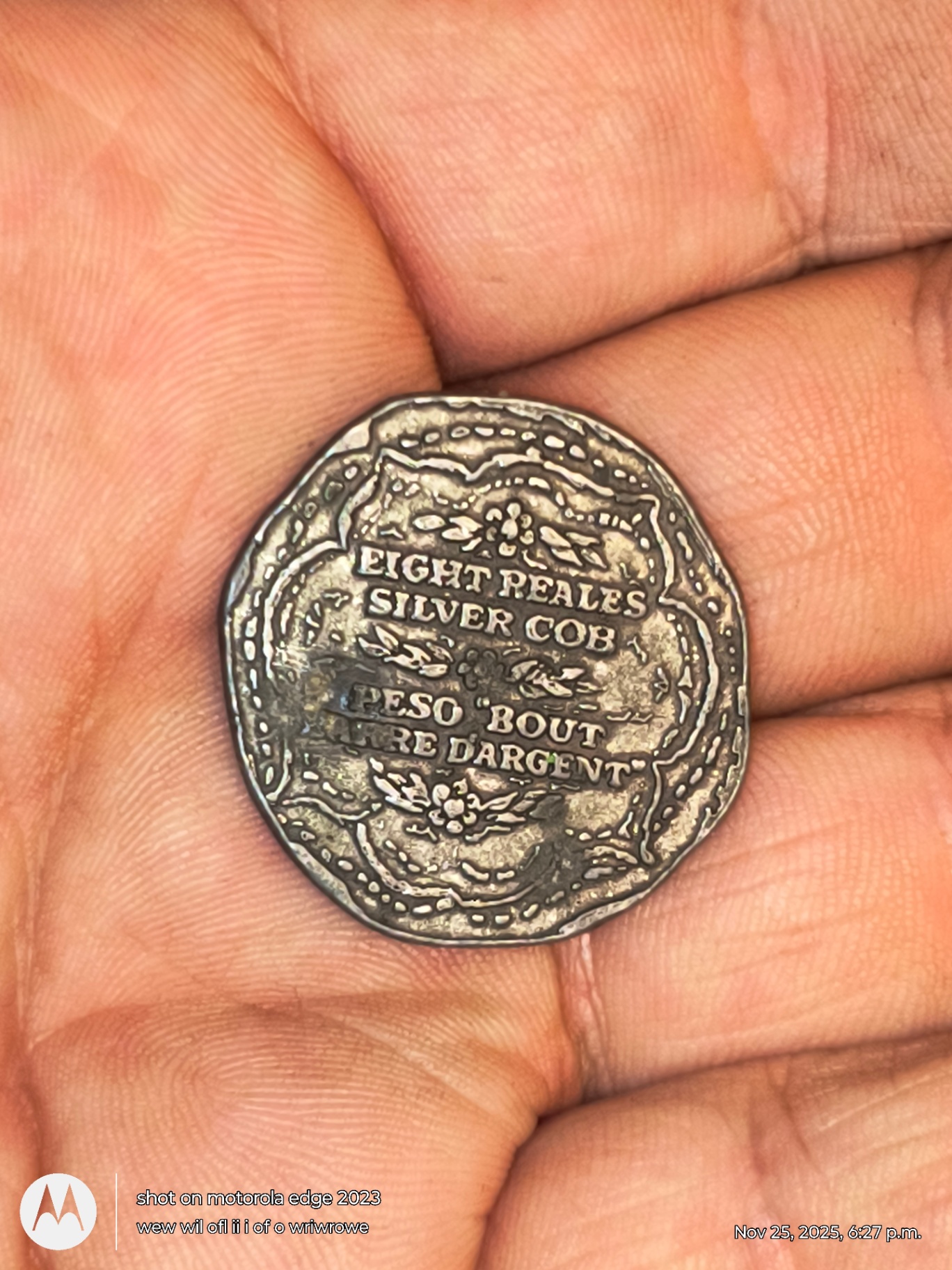A single eight reales silver replicacob coin with an irregular, textured edge and two faces bearing inscriptions and a decorative motif.
