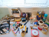 An assortment of electrical supplies, tools, tapes, sealants, sprays, cords, a wiring repair booklet, concrete crack seal, a roll of magnet tape, and door seal strips.